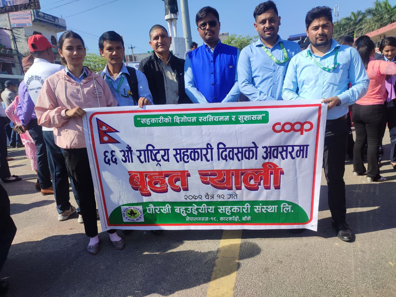 “सहकारीको दिगोपना स्वनियमन र सुशासन” भन्ने मूल नाराका साथ ६६ औँ राष्ट्रिय सहकारी दिवसकाे अवसरमा आज २०७९ चैत्र १९ गते सम्पन्न भएको सहकारी अभियन्ताहको संयुक्त सहकार्यपूर्ण रेलीमा पौरखी बहुउद्देश्यीय सहकारी संस्था लि को सहकार्यका झलकहरु ।